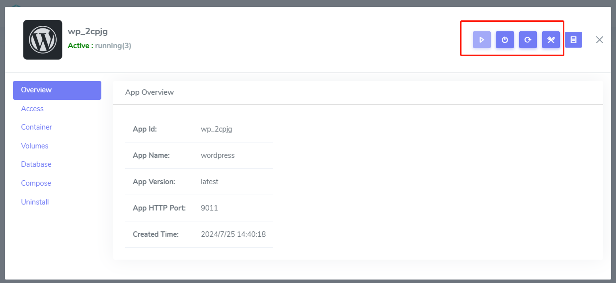 Websoft9 simplify the main operations of the application: start, stop, restart, redeploy, uninstall, and so on.