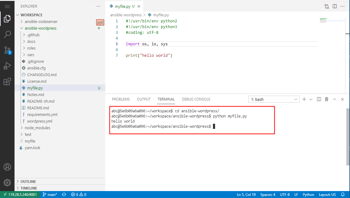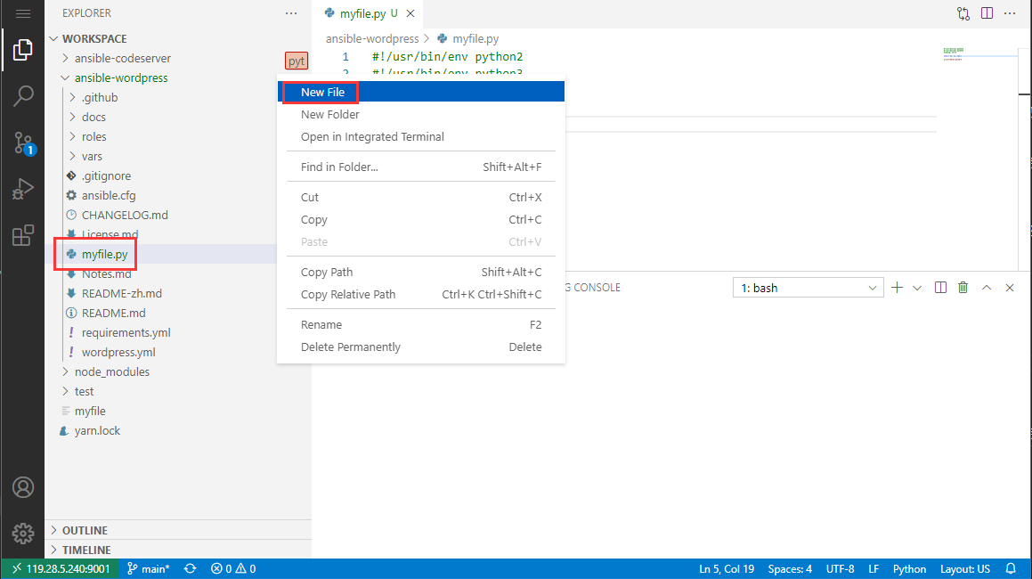 Log in to code-server, create a new folder and file named: myfile.py, and copy the following Python example code into the file.